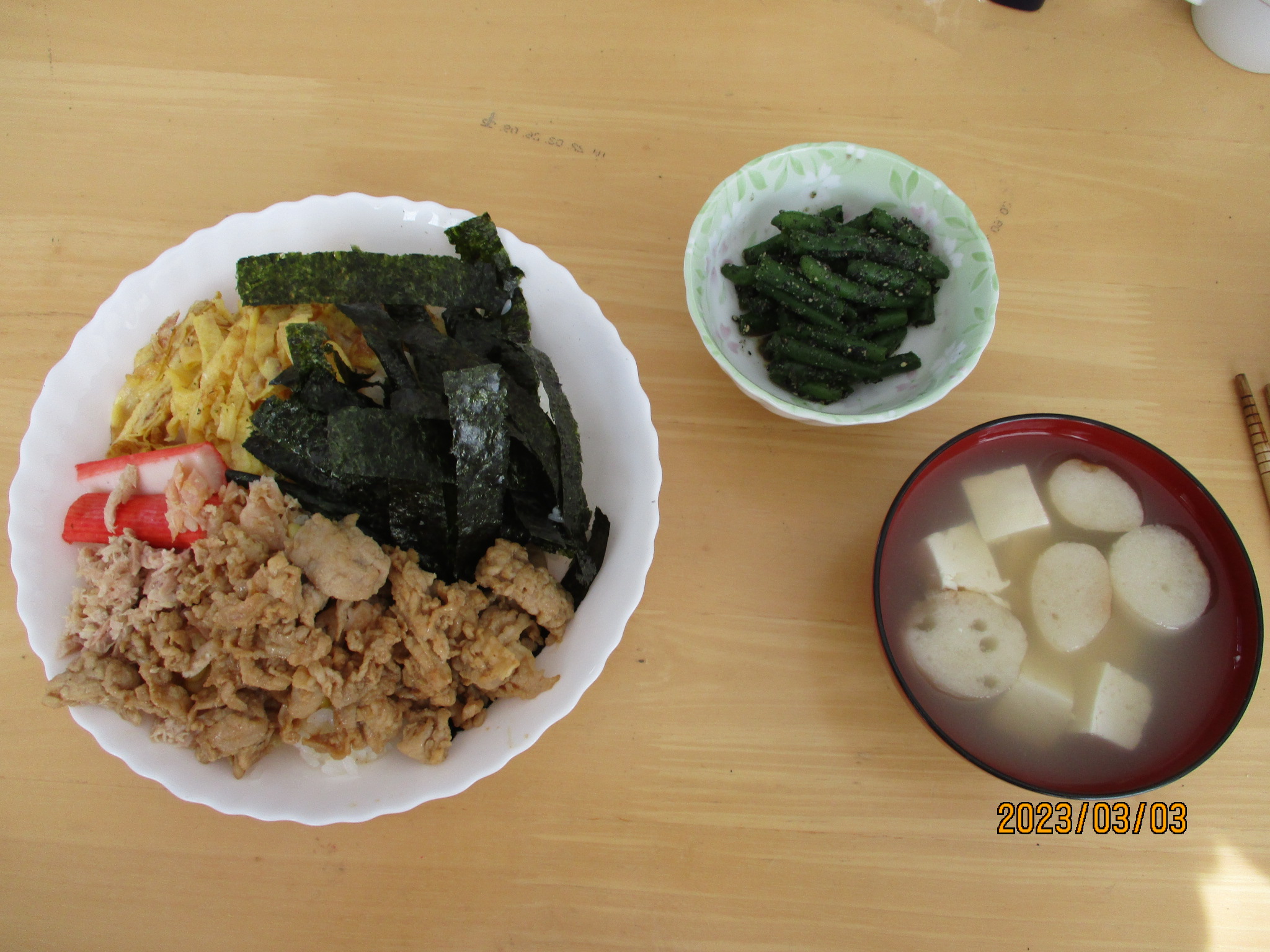 ちらし寿司とインゲンの胡麻和えとすまし汁でした。