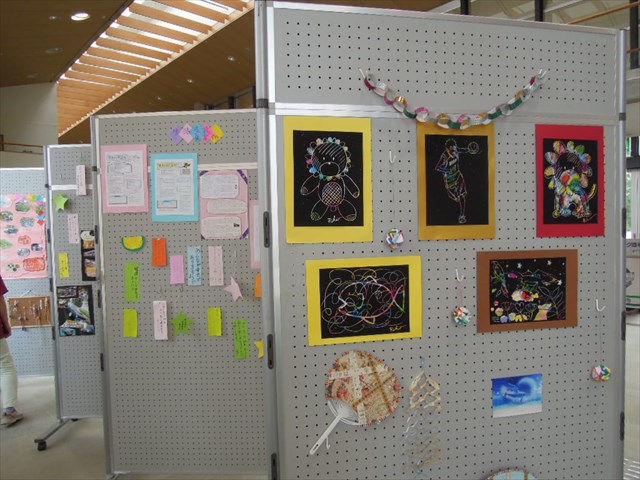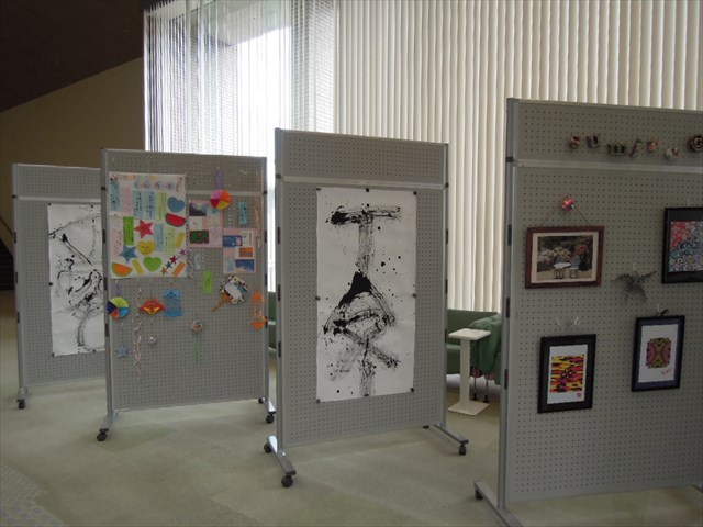 すみれのプログラムで作ったプラ板、レジンアート、アート書道などの作品を展示したので