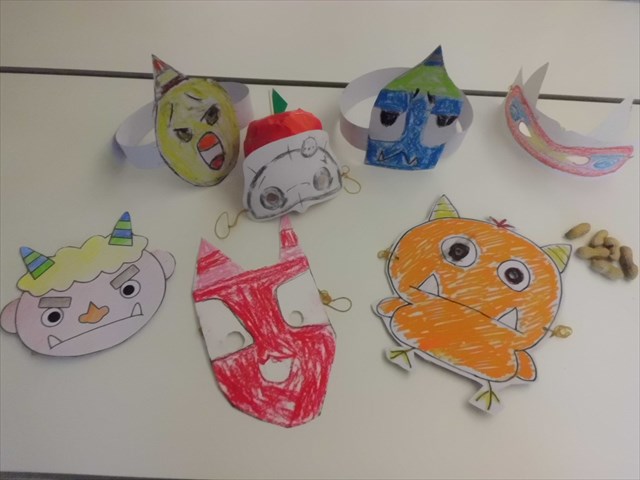 午後のプログラムは豆まきとお面作りをしました