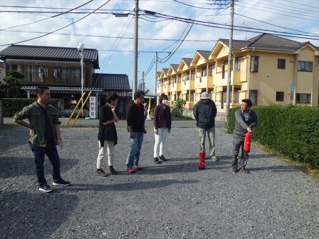 火災発生から火災発生場所の確認、初期消火、避難誘導、消防への通報を行う。その後、地域の避難場所である生涯学習センターに退避する。最後に消火訓練をして終了