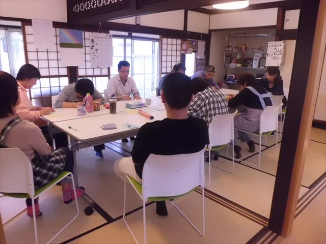4月27日(月)に保健相談センターから講師を招いてこころの健康講座を行ないました。 非言語的コミュニケーションで「今日のお昼ごはん」・「好きな食べ物・苦手な食べ物」を書いているところ