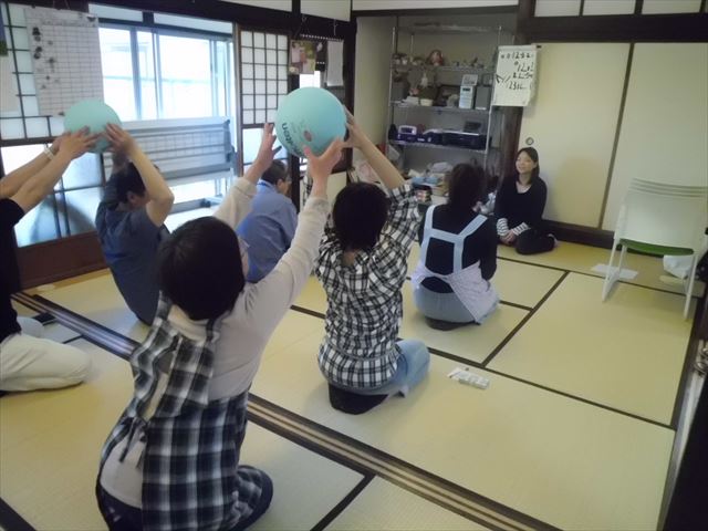 ウォーミングアップで列に並んでボール送りをしました。 最後に緊張とリラックスで顔ヨガを行って終了しました。